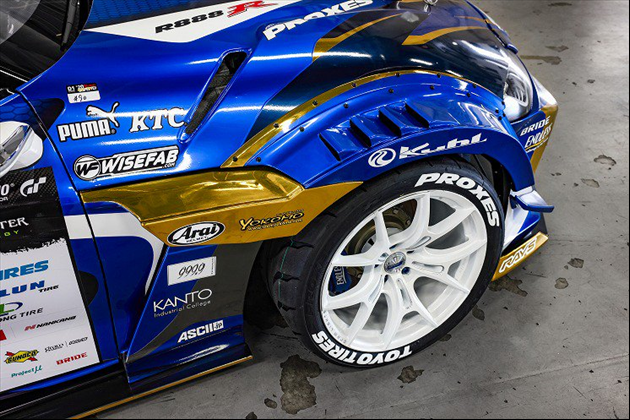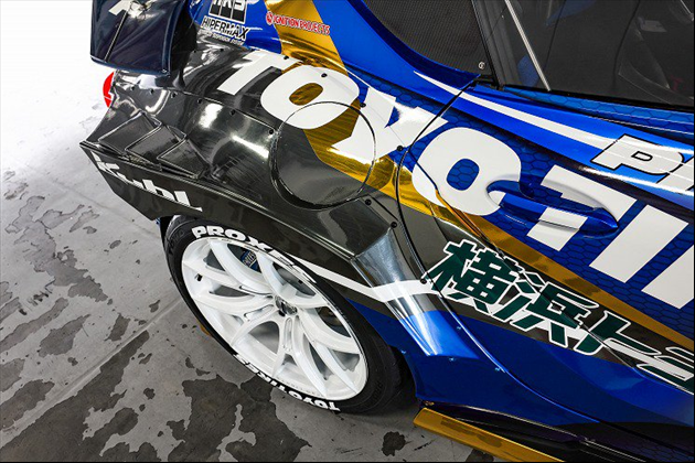 ・「90R-GTWワイドボディキット」をベースに、ドリフト競技で要求される、フロントキレ角アップ、サスペンションストロークの大きさ、軽量化などに対応するために、徹底的に性能を煮詰めて開発しました。まさにドリフト競技で勝つためのボディキットに仕上げました。