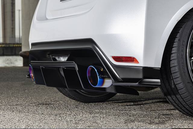 ・リアセンターディフューザーは、レーシングカーを彷彿とさせる迫力あるリアビューを実現します。リアハーフディフューザー装着にて確保されたバンパー下部のスペースを生かし、空力特性が期待出来る4枚フィン形状のディフューザーとなります。センターの2枚フィンは脱着可能な別体設定となっています。