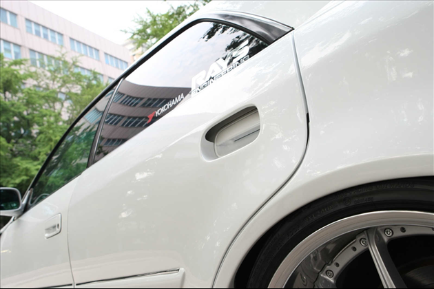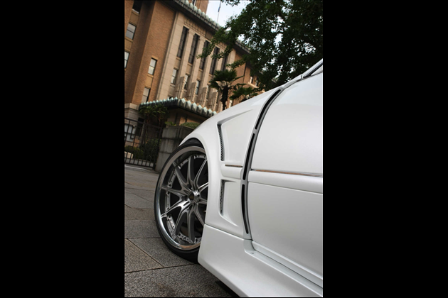 リアドアまでもワイド化することで初めて成り立つ、4枚ドア専用の完全設計ワイドボディキットは、セダンでありながらスポーツクーペに並ぶ迫力を実現。