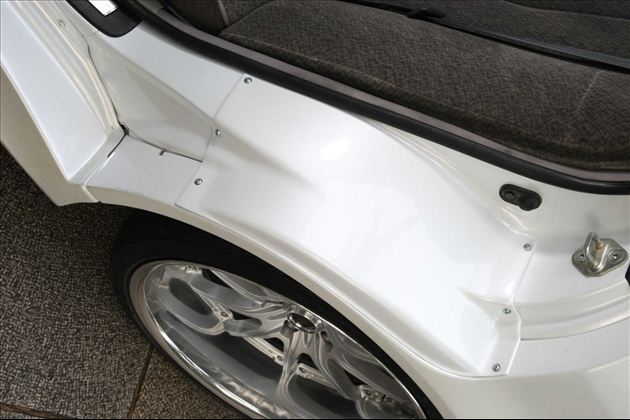既存のワイドフェンダーとは異なり、ドアの切り欠きを含めてラインを構成することで、全体に破綻のないリアフォルムを実現。
