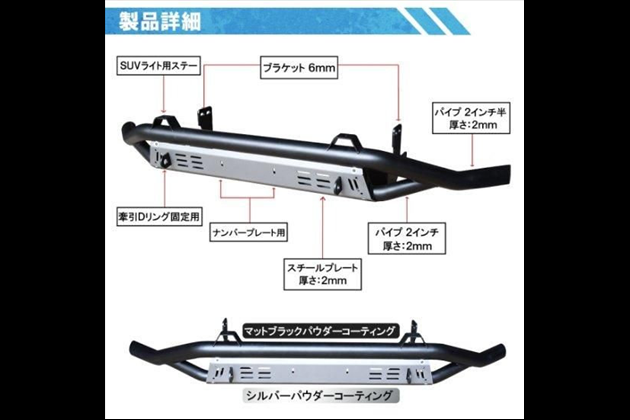 ・上部にライト固定ステーが2か所、ナンバープレート用穴、牽引Dリング固定用フック付き!利便性も考えて開発!