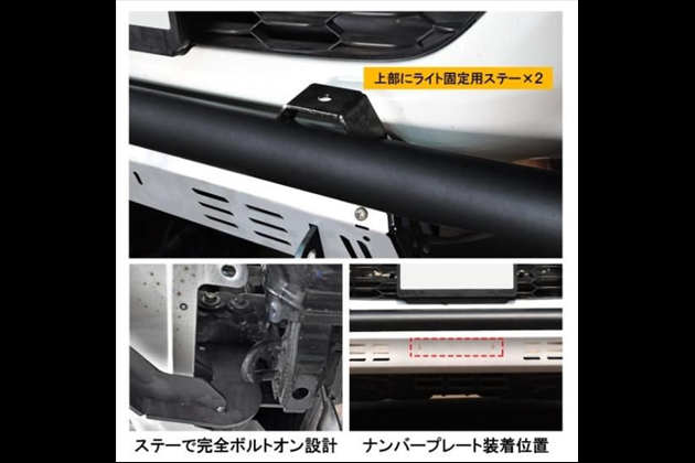 ・上部にライト固定ステーが2か所、ナンバープレート用穴、牽引Dリング固定用フック付き!利便性も考えて開発!