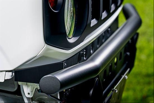 フロントグリル下の内板は見せたくないという人へトラディショナルバンパーは純正のフロントバンパーを丸ごと取り外して装着するタイプ。そのため、ガードパイプのスキマから純正バンパーで隠れていたフレームなどがチラ見えしてしまう。クロカンのカスタムではお馴染みの仕様だし、ワイルドな雰囲気が出ていい感じなのだが、ちょっと気になる人もいるかもしれない。特にフロントグリル下のいびつな内板を見せたくないという人は、専用エプロン装着がオススメだ。素材はトラディショナルバンパーと共通のステンレス製。カラーリングも同じく粉体塗装によるブラック仕上げとなる。目隠しアイテムなのでシンプルなデザインだが、純正フレームっぽく丸穴を設けるなど、ヘリテージらしい丁寧な作り込み。違和感なく自然にカバーできるのが嬉しい。トラディショナルバンパー64・74/トラディショナルバンパーLEVELⅡ64に対応。この製品は、JB64Wジムニー、JB74Wシエラ、JC74Wノマドに対応しています。