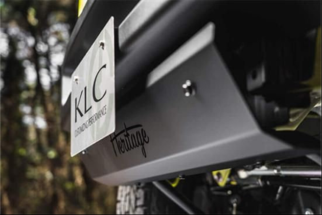 「New Normal」フロントショートバンパーに合わせて開発された専用のスキッドプレート。ショートバンパー化で丸見えになってしまう腹下を適切にカバーしつつ、オフロードテイストを強化。コーナー部のアール処理や折り曲げの角度、絶妙なサイズ感など、一見無骨ながら綿密な計算の上で作られている。素材は高硬度で耐食性にも優れたSUS304ステンレス鋼を採用。カラーはトラディショナルバンパー(ブラック)と同じ黒の粉体塗装が施され、四駆に相応しいマットな質感が楽しめる。中央にはレーザー加工にてくり抜いた「Heritage」のブランドロゴを投入。ただし文字サイズ小さめ&ナンバープレートでほとんど隠れる位置なので、主張はごく控えめになっている。ボディ側に穴開け加工の必要はなく、ボルトオンで装着可能。