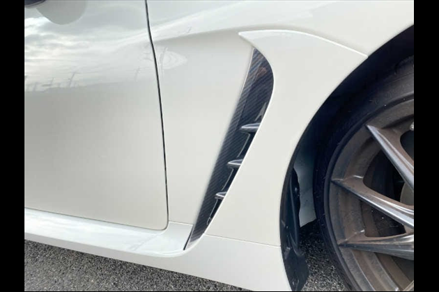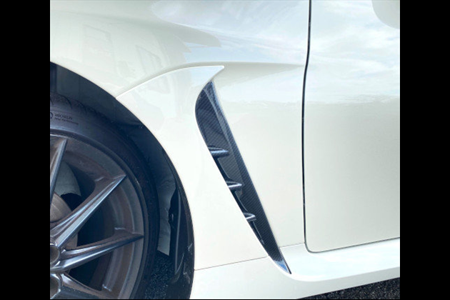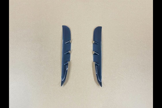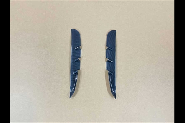 透明アクリル(耐衝撃)樹脂の裏面に特殊印刷でカラーリングした成形品のフェンダーダクトカバーで車両(GR86)フェンダーダクト内に両面テープで取り付けます。