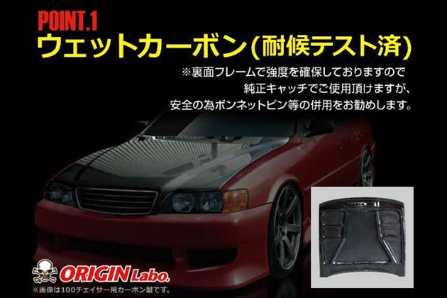 オリジン エアロボンネット Type-2 純正とは違うラインで、フロントフェイスが一変します。リアダクト方式で熱風の排出が可能、センターダクト方式+αの冷却に成功しました。裏面は熱風の排出を熟慮した設計を施しています。センターダクトがないため、雨天使用可能、洗車OK。実装テスト済み。